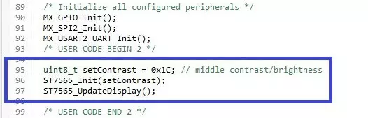 In main.c a few modifications are needed to complete the application. The #include “st7565.h” needs to be added to the code. After the generated includes, the previous line gets placed between the USER CODE BEGIN/END includes comments as shown below.
