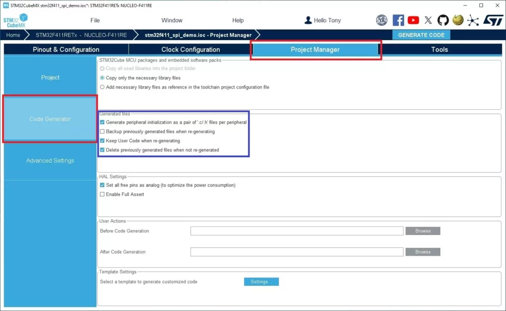 In the next section “Code Generation”, make sure the radio button “Copy only the necessary files” is selected and that the check boxes “Generate peripheral code initialization as a pair of ‘.c/.h’ files”, “Keep User Code when re-generation”, and “Delete previous generated files when not re-generated”.