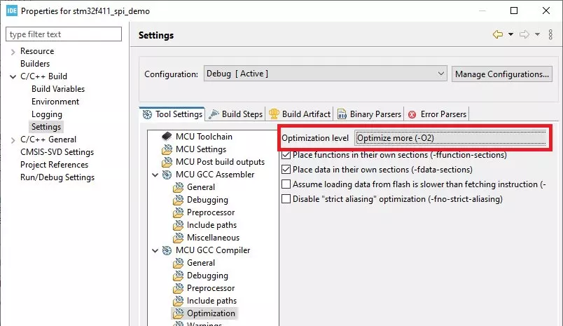 The next step in creating the firmware is setting the optimization level. The typical setting is ‘-O2’ for a good compromise between execution speed and code size. If left at ‘-O0’, there would be no optimization for execution speed and code size. Depending on whether debugging the application code or releasing the application code the optimization settings can be adjusted. In this application, it will be changed to ‘-O2’.