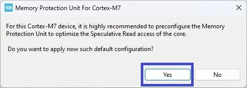 The second pop up dialog will influence code generation. The dialog asks if it should enable the Memory Protection Unit (MPU) to optimize the Speculative Read access of the M7 core. This will add code for configuring the registers involved with the MPU and Speculative Read. This is a minor amount of code and should not affect the operation of the display. Again, selecting “No” is a viable option but in the case of this application note “Yes” was selected and the resulting code compiled into the firmware.
