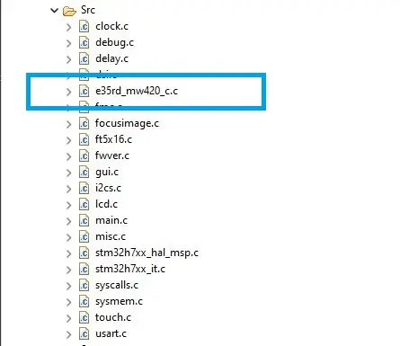 Using the e43gb_i_mw405_c.h and .c files as examples, create a new header file in the Inc folder and a new source file in the Src folder. Name the files e35rd_mw420_c.h and e35rd_mw420_c.c. Once that is completed, code will be added to the new header file.