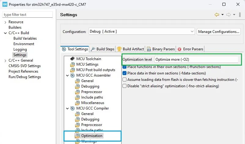 Then in the Tool Settings tab on the right, select Optimization and set the Optimization level to -O2.