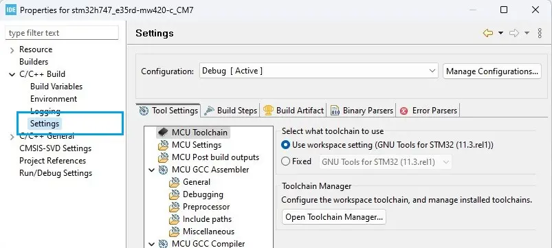 The next step in creating the firmware is setting the optimization level. The typical setting is ‘-O2’ for a good compromise between execution speed and code size. If left at ‘-O0’ there would be no optimization for execution speed and code size.