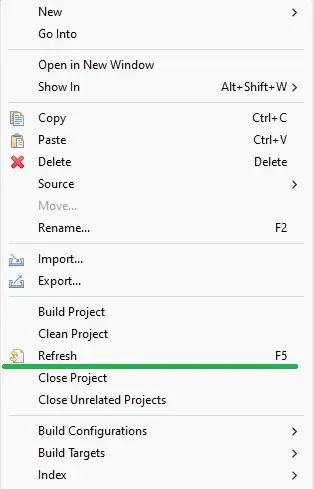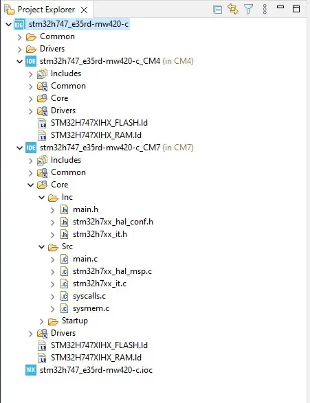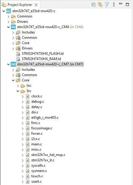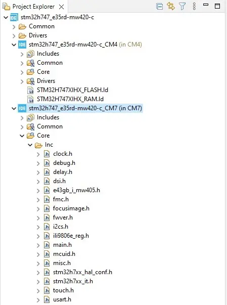 Again, the project will need to be refreshed. Right click on: stm32h747_e35rd-mw420-c_CM7 to bring up the menu and select refresh. Once the refresh has been completed the newly added files will be part of the project as shown below: