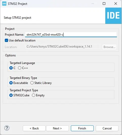 The next two pop up dialogs have optional selections. In both cases, “Yes” was selected. The first is whether the Pinout Configuration Perspective is opened after project generation is completed. “No” can be selected with no effect on the code base.